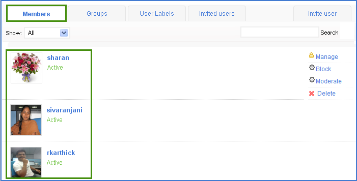 Identify the member whom you would like to block and click on Block link. The corresponding is now blocked and you can unblockthe user using Unblock link, whenever needed.